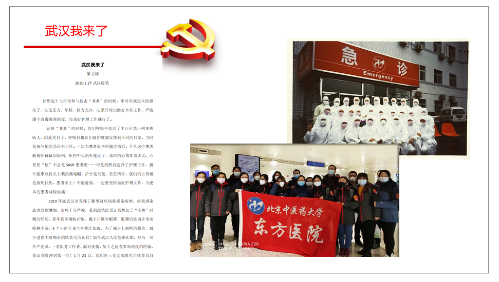 在醫院的疫情防控工作中,支部黨員綦文婧擔任新建發熱門診首任護士長,將武漢抗疫精神在東方醫院繼續傳承和發揚。支部黨員同志們有的堅守在急診預檢分診、有的堅守在核酸取樣室、有的奮戰在急診一線、有的駐守在過渡病房。黨員們上下齊心,高質量地完成了醫院抗疫、急救和教學任務,體現了共產黨員的職責與擔當。