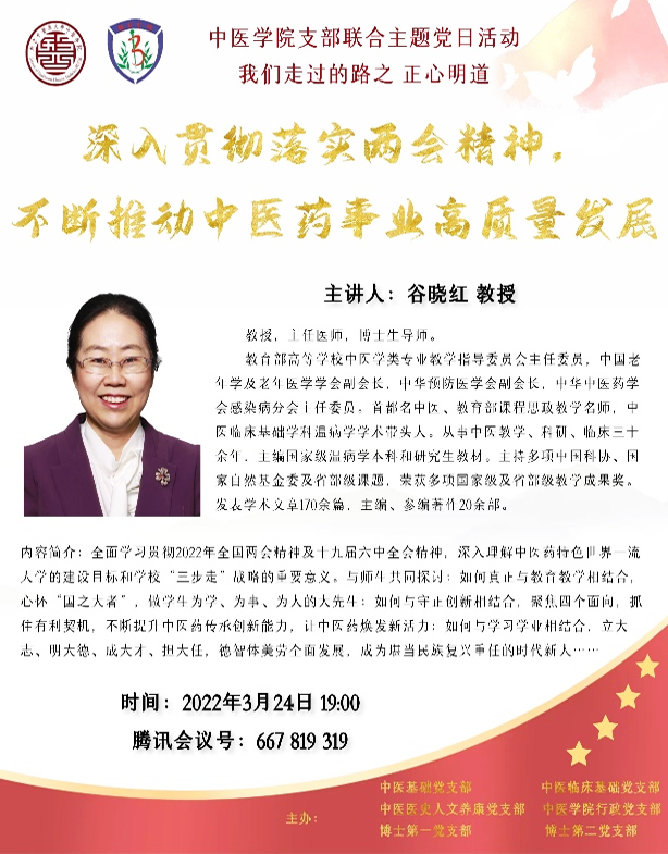 支部始終以黨建為抓手,以教研室為紐帶,落實“高教大計,本科為本”方針,嚴格執行“教授上講臺”,利用優質學科平臺,持續做好新老教師傳幫帶,著力打造優秀教學團隊。支部現擁有1個國家級重點學科、1個北京市重點學科、2個國家中醫藥管理局重點學科,教育部教學團隊和北京市級優秀教學團隊各1個。“傷寒論”課程被評為“北京高等學校優質本科課程(重點)”,主講人被評為“北京高等學校優秀專業課(公開課)主講教師”。