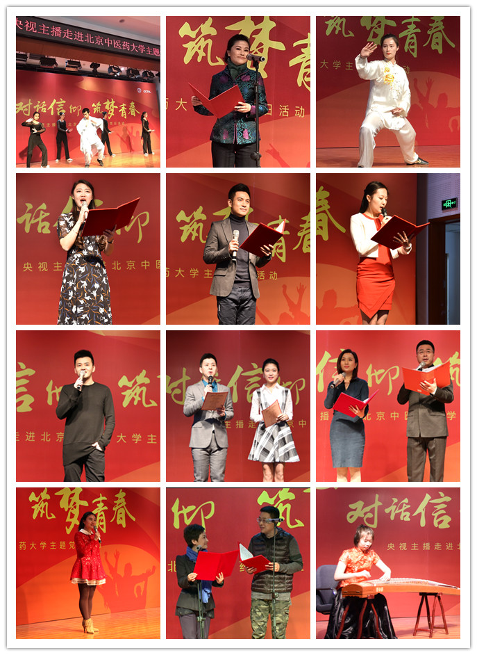 為強化黨員黨性觀念和宗旨意識,進一步提高黨員素養(yǎng),激勵黨員樹立崇高理想和堅定信念,鞏固和加強基層黨組織力量,我校學(xué)生工作部黨支部與中央電視臺新聞中心新聞播音部黨支部于12月23日下午舉辦了“對話信仰,筑夢青春”主題黨日活動。出席本次活動的有校黨委副書記、副校長翟雙慶,組織部部長曾鳳,機關(guān)黨委常務(wù)副書記、機關(guān)事務(wù)處處長歐陽方,學(xué)生工作部部長、學(xué)生工作部黨支部書記杜偉,招生與就業(yè)處處長田潤平,后勤處處長梁軍,人文學(xué)院黨委書記林建平,研究生工作部副部長、研究生院副院長傅騫,團委書記李天罡,中藥學(xué)院黨委副書記艾路,護理學(xué)院黨總支副書記牛慧君等校方領(lǐng)導(dǎo)及我校輔導(dǎo)員老師和同學(xué)們。來自中央電視臺新聞播音部的嘉賓有著名主播賀紅梅、崔志剛、納森、經(jīng)蓓、和佳、何巖柯、嚴於信、王言等。