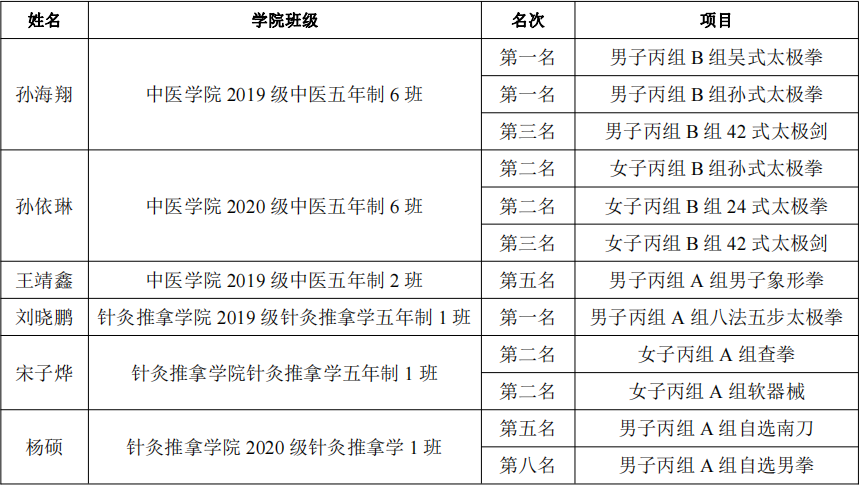 在比賽中,武術隊健兒們沉著冷靜、完美發揮,充分展現了北中醫人的精神品質和競技風采。最終,在帶隊孫獻忠老師和王帥老師的悉心指導下,面對眾多強手,我校健兒們不畏艱難、表現出色,獲得金牌3枚、銀牌4枚、銅牌2枚。孫獻忠老師獲“優秀教練員”稱號,劉曉鵬、宋子燁同學獲“優秀運動員”稱號,我校榮獲“體育道德風尚獎”。
