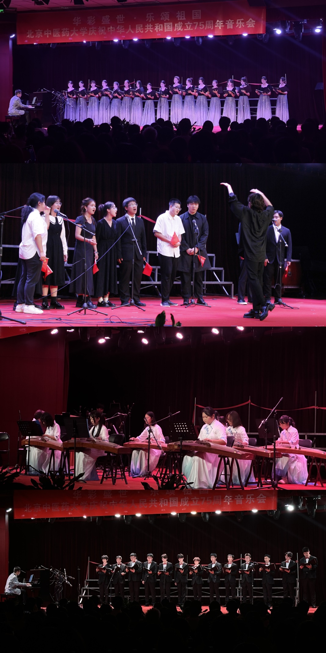9月29日,由校團委主辦,大學生藝術團承辦的“華彩盛世·樂頌祖國”——北京中醫大學慶祝中華人民共和國成立75周年音樂會在良鄉校區學生活動中心四層舉辦。校黨委副書記張繼旺、校團委書記宋珊珊、校團委副書記代立飛參加,與400余名學生齊聚一堂觀看演出。