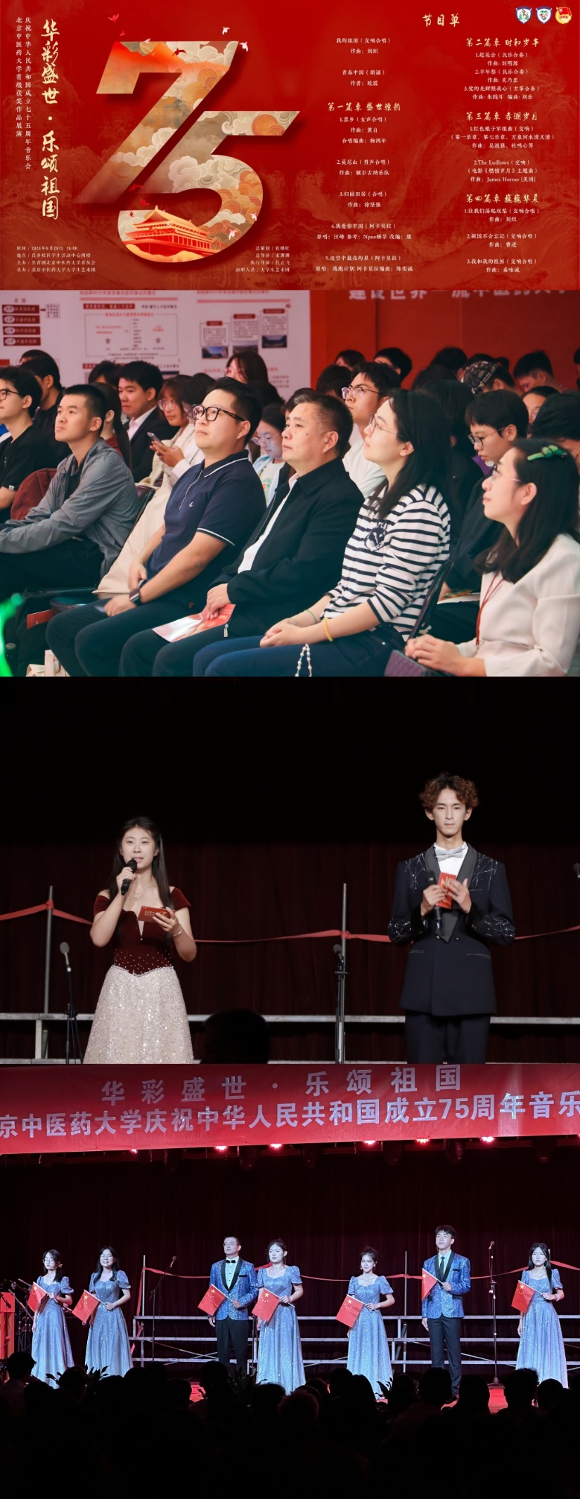 音樂會在交響合唱《我的祖國》中正式拉開序幕,校大學生藝術團管弦樂團、合唱團、話劇與朗誦團、民樂團、阿卡貝拉人聲樂團5大分團的演出人員從動人心弦的“盛世雅韻”到熱情飽滿的“時和歲豐”,從激情高亢的“赤潮歲月”到氣宇恢宏的“巍巍華夏”,通過管弦樂、合唱、朗誦、民樂等多種節目形式,謳歌中華人民共和國成立75周年來的光輝歷程,為觀眾呈現了一場美妙絕倫的視聽盛宴,其超高水平的演出贏得全場熱烈掌聲,激起師生濃烈的愛國情誼和民族自豪。