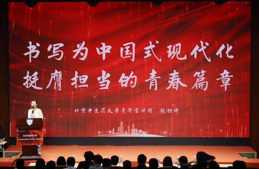 青年宣講團成員代表、中藥學院張鍶琦同學以“書寫中國式現代化挺膺擔當的青春篇章”為題進行宣講。她從“中國式現代化”為切入點,分享了她所了解的西部計劃志愿者——中藥學院碩士畢業生高德岷在云南支教的故事,以及去年暑期她跟隨團隊前往云南騰沖進行社會實踐的感悟。通過實踐實地感受鄉村振興給老百姓帶來的巨大變化,更加堅定了作為新時代青年肩負的責任和使命。