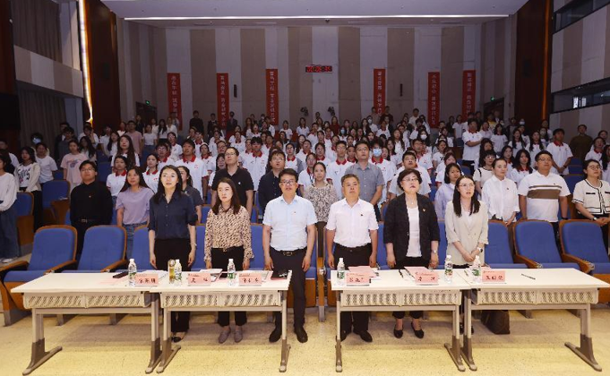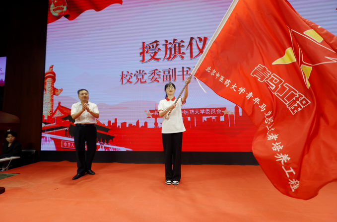 校黨委副書記張繼旺為2024年“青馬工程”培訓班授旗,中醫學院本科生葉鋇鋇作為新學員代表接旗。