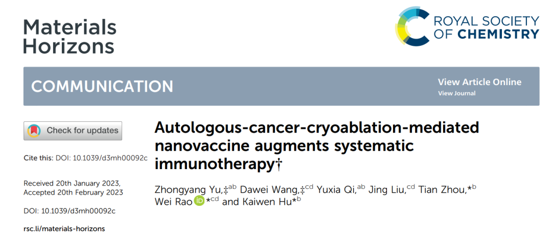 近日,我校第二臨床醫學院(東方醫院)胡凱文教授、周天副教授和中科院理化技術研究所饒偉教授團隊聯合在 Materials Horizons 上以“Autologous Cancer Cryoablation Mediated Nanovaccine Augments Systematic Immunotherapy”為題,在線發表了關于黃芪多糖納米腫瘤疫苗聯合冷凍消融治療癌癥的研究論文(IF="15.717,JCR" 1區,中科院1區),展示了黃芪多糖納米腫瘤原位疫苗用于癌癥治療的突破性成果。團隊創新性地合成中藥納米腫瘤原位疫苗,利用微創冷消融手術后腫瘤碎片作為自體抗原,靶向淋巴結,激活機體腫瘤抗原特異性免疫,從而以局部治療引發系統性抗癌免疫效應,為晚期癌癥患者帶來新的希望。這也是對中醫理論“衛行脈外”在癌癥治療領域的新詮釋。該研究得到了國家自然科學基金項目和國家重點研發計劃項目的資助。