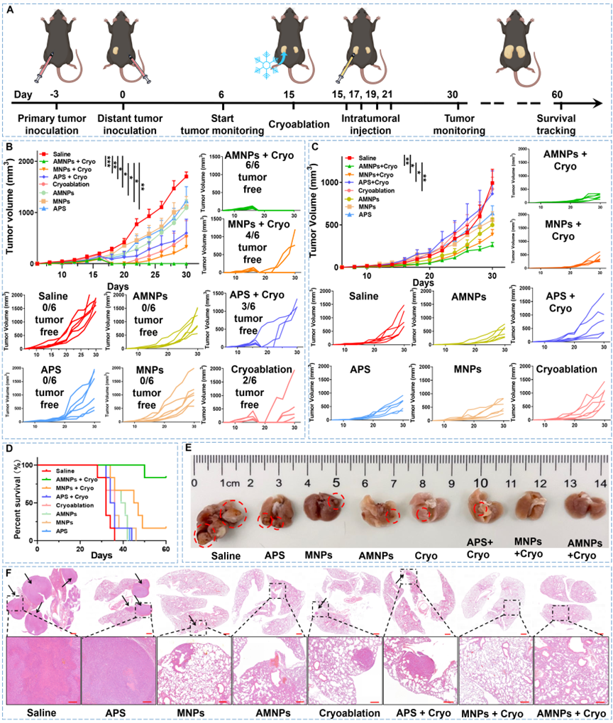 該聯合團隊長期從事冷凍消融治療腫瘤的臨床及基礎研究,曾共同開展了國際首臺冷熱復合治療系統的臨床實驗。在此最新研究中,該團隊總結了數十年冷凍消融臨床研究,為促進和強化冷凍消融的“遠端效應”, 同時結合中藥免疫佐劑特點,以中醫腫瘤臨床最為常用的補氣藥黃芪為切入點,設計了高效抓取冷凍消融碎片的納米腫瘤疫苗,提出了黃芪多糖納米腫瘤疫苗與冷凍消融手術聯合應用的癌癥治療模式,該方法除對局部腫瘤進行有效殺傷外,同時具有激活全身的腫瘤抗原特異性免疫、抑制遠端及轉移瘤體生長的重要作用。
