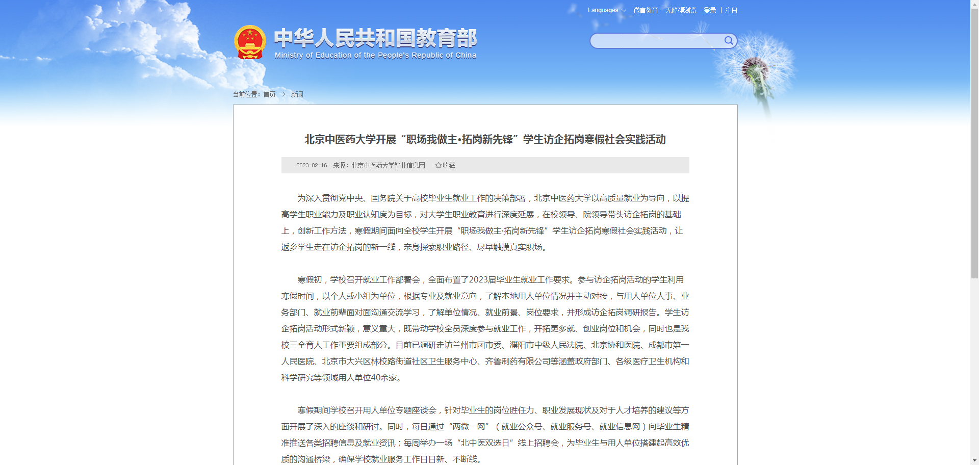2023年2月16日,教育部網站報道我校開展“職場我做主?拓崗新先鋒”學生訪企拓崗寒假社會實踐活動,全文如下: