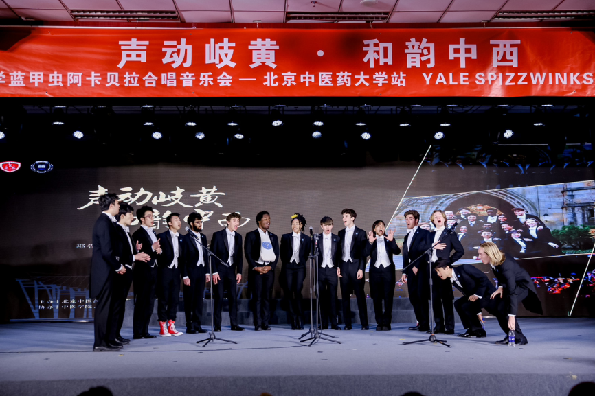 3月19日,北京中醫藥大學團委與耶魯大學藍甲蟲阿卡貝拉人聲樂團(簡稱藍甲蟲合唱團)聯合舉辦“聲動岐黃·和韻中西”主題文化交流活動,擁有111年歷史的耶魯大學藍甲蟲合唱團受邀到訪,北京中醫藥大學黨委副書記張繼旺、房山區團區委書記劉堯及校內外師生代表共同出席活動。本次活動以“體驗、探索、共創”為核心,通過沉浸式文化參訪、學術互動與聯合演出,搭建中西文化互鑒的橋梁。