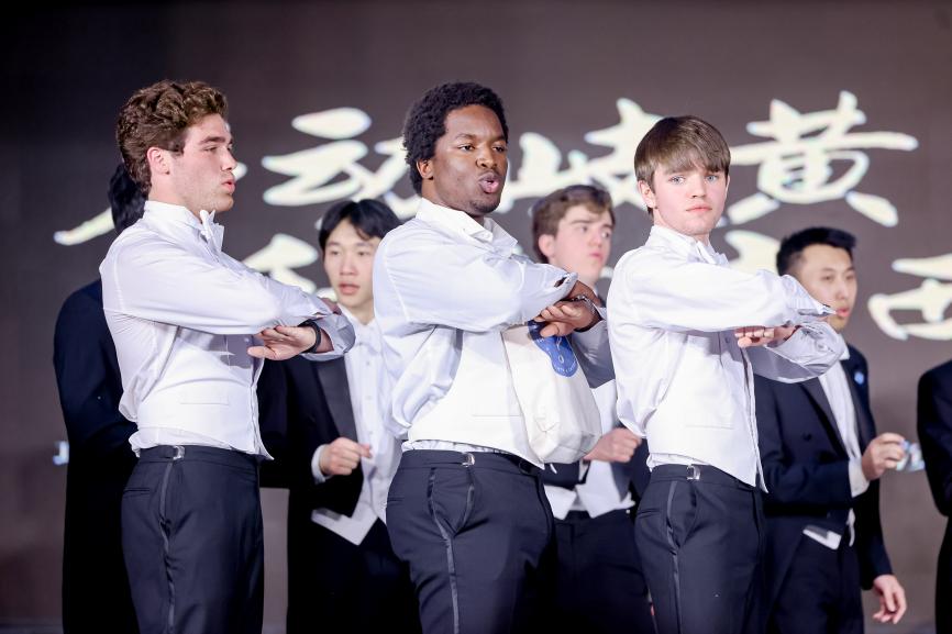 演出環節以多元文化共鳴詮釋了學校開放包容的精神底色。北中醫阿卡貝拉樂團以經典英文歌曲Take Me Home, Country Roads拉開序幕,傳遞東道主的熱情。藍甲蟲合唱團則以中文自我介紹開場,并演繹Blue Skies、No Regrets等英文經典曲目。令人矚目的是,樂團特別獻唱中文歌曲《橄欖樹》《好漢歌》《當你老了》,展現了跨文化藝術的深度融合。