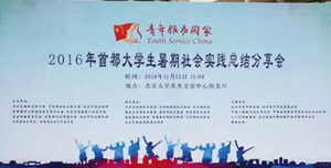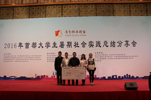 11月13日下午,“青年服務國家”2016年首都大學生暑期社會實踐總結分享活動在北京大學英杰交流中心隆重舉行。我校吳瓊同學作為2016首都暑期社會實踐百強團隊代表之一接受了中國工商銀行、中國電信等愛心企業贈送的愛心支票。