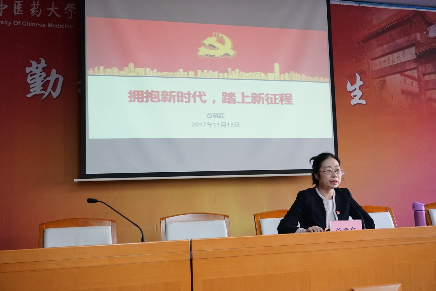 開班儀式之后,谷曉紅書記為現場全體人員做了題為“踏上新征程,擁抱新時代”的專題報告。谷書記以習近平總書記在參觀中共一大會址的講話為切入點,圍繞“初心”和“使命”兩個關鍵詞,將黨的歷史和我們學校在黨的領導下的奮斗歷程,娓娓道來。她指出,共產黨人的初心就是為人民謀幸福,為民族謀復興。通過陳望道翻譯《共產黨宣言》的軼事,讓同學們體會到“真理的味道是如此甘甜”;通過介紹毛澤東同志關于陜北的論述以及斯諾《紅星照耀中國》中具體事例的描述,引導同學們認識到“延安精神”的本質;通過與現場學員們交流前不久參觀“砥礪奮進的五年”大型成就展的感想,促使同學們感悟到是共產黨的領航,實現了中國從生靈涂炭到富強民主的轉變,尤其在過去的五年里,黨和國家事業發生了歷史性的變革,取得了歷史性的成就。