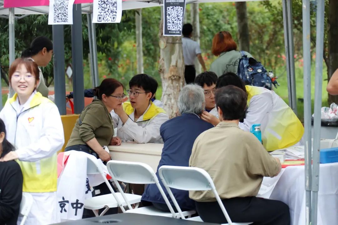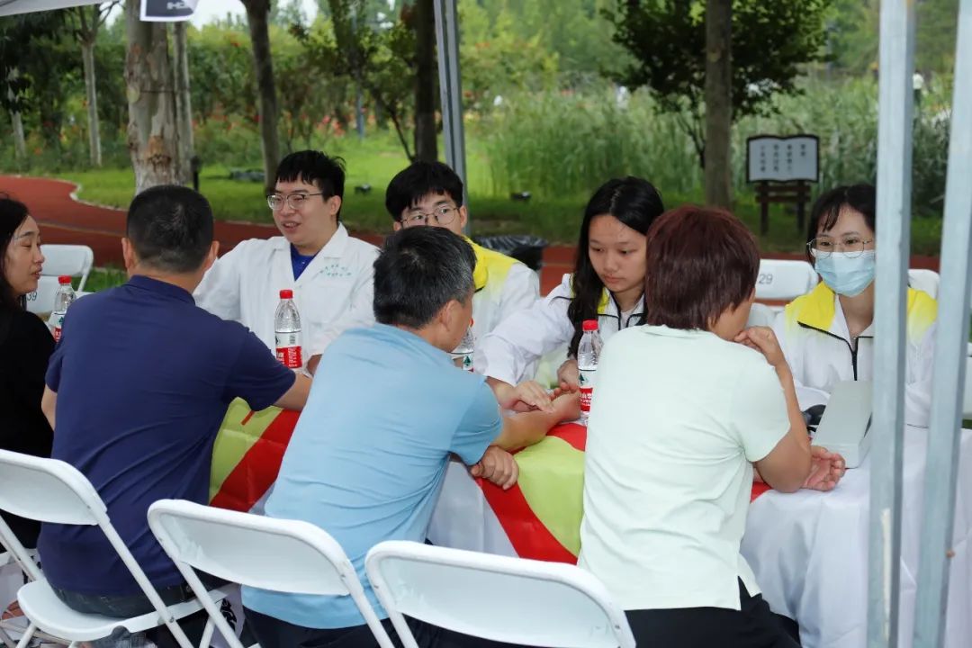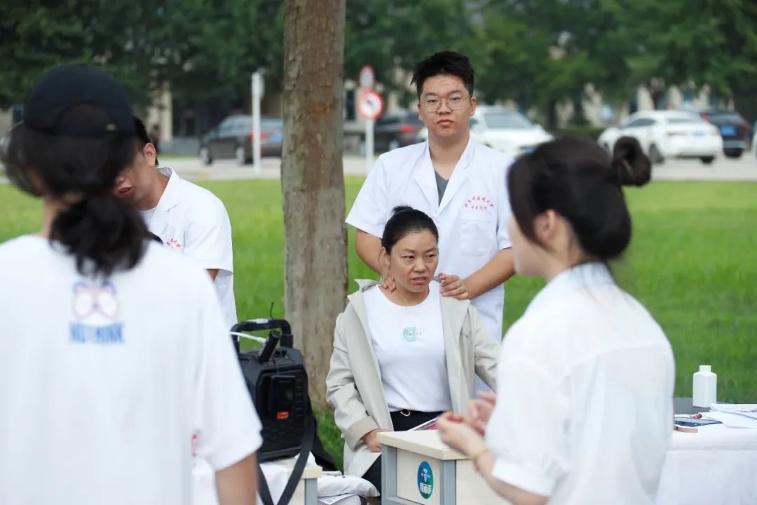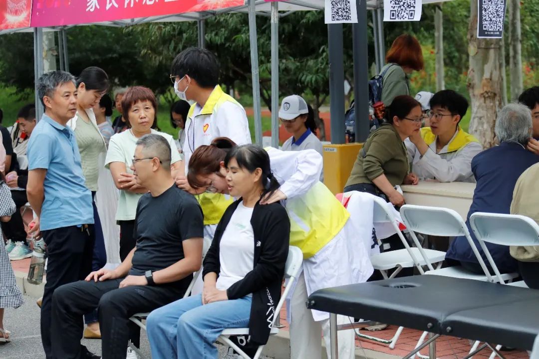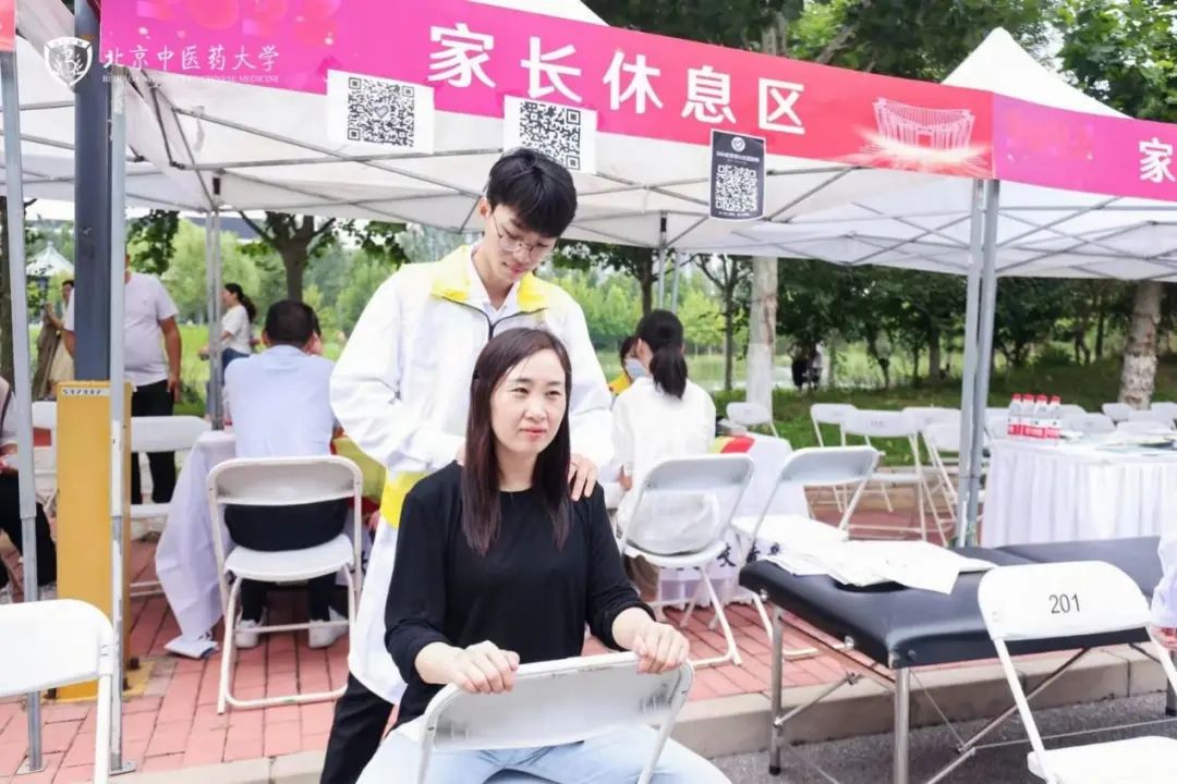 在家長休息區,有學校精心熬制的防暑酸梅湯,也有志愿者同學提供按摩推拿體驗。這一項項中醫特色體驗,一方面讓新生和家長緩解了長途跋涉的勞累,同時也讓新生剛入校就可以直觀地感受到中醫適宜技術的療效和神奇。