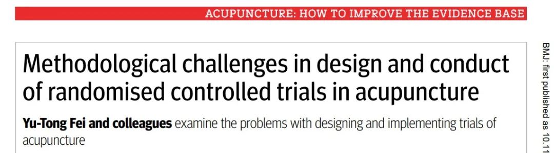 北京中醫藥大學循證醫學中心團隊在針灸臨床研究方法學和衛生經濟學領域取得重大進展,系列成果發表在國際醫學領域頂級期刊英國醫學雜志(BMJ,最新影響因子39.89分)上。兩篇文章是名為“針灸:如何促進證據基礎”(Acupuncture: How to Improve the Evidence Base)五篇系列文章中的兩篇(https://www.bmj.com/acupuncture)。