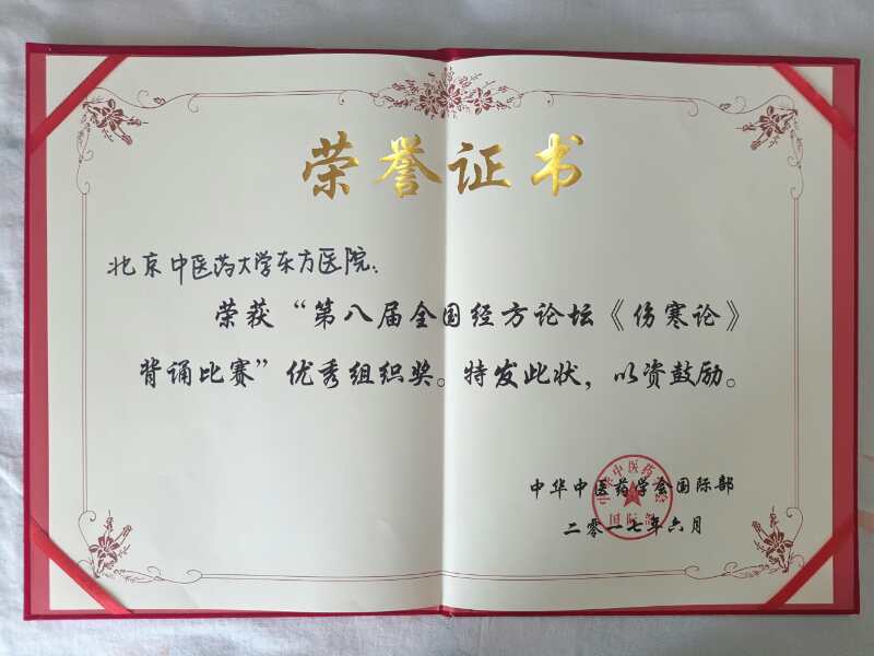 6月1日至6月4日,由中華中醫藥學會、北京中醫藥學會仲景學說專業委員會舉辦的第八屆全國經方論壇舉行,我校附屬東方醫院組隊參加論壇舉辦的傷寒論背誦比賽,李鵬主治醫師獲得第一名。