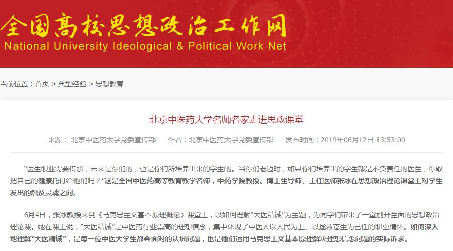 張冰,全國優秀科技工作者、全國中醫藥高等教育教學名師、教育部國家級中藥學教學團隊帶頭人,國醫大師顏正華的學術經驗繼承人。張冰教授跨專業講授思政課,是該校結合中醫院校學科特色,實現思政課程和課程思政的深度融合,也是該校“社會主義核心價值觀與‘大醫精誠’教育教學改革示范點”的一次思政課教改嘗試。該示范點是北京市委教育工委設立的第一批高校思想政治理論課教育教學改革示范點,由校黨委書記谷曉紅教授擔任示范點負責人。北京中醫藥大學還將陸續邀請更多深受學生歡迎的名師名家走進思政課堂講述理想信念和責任擔當,努力實現思政課程和課程思政深度融合,積極構建全員全過程全方位育人體系。