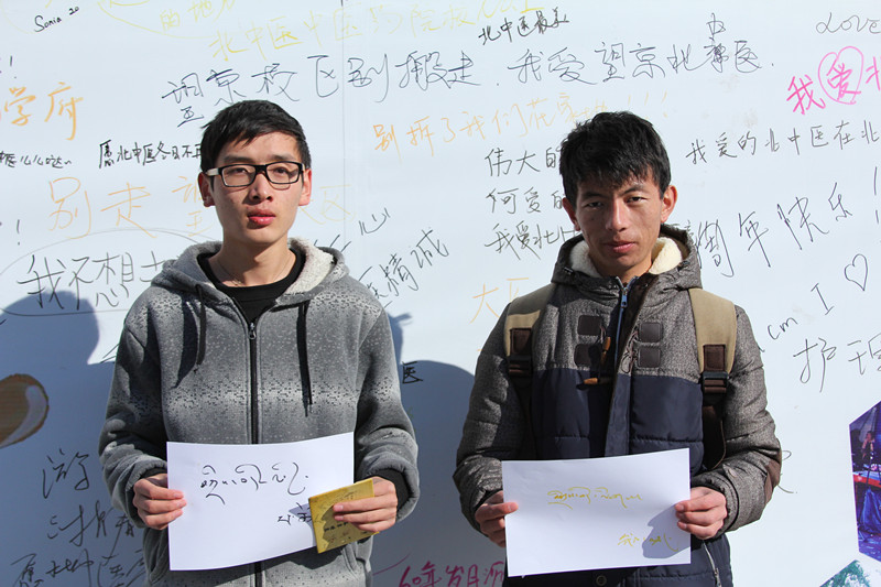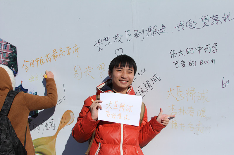 活動中,歡聲笑語回響在小小的望京校區,無限的熱情驅散了冬日的寒意。大大的背板上寫滿了“大醫精誠”、“博大精深”、“最美北中醫”、“北中醫我的家”等深情款款的文字,無一不流露著同學們對學校的深厚情感。