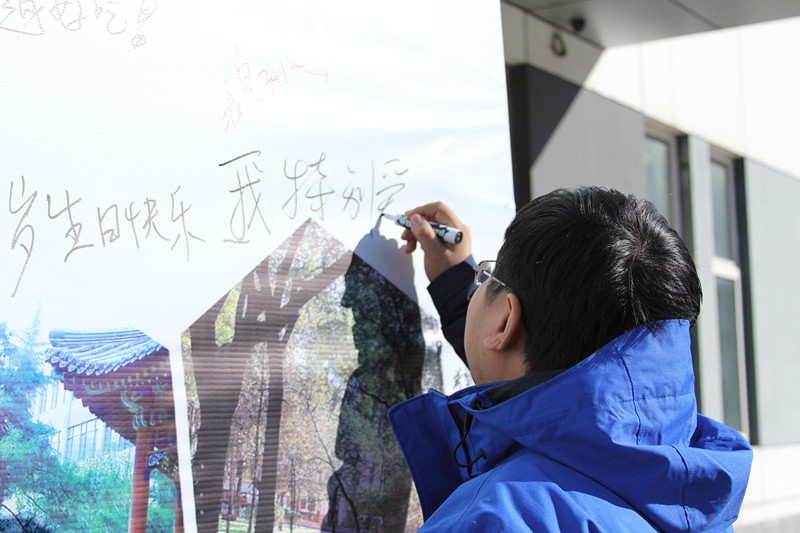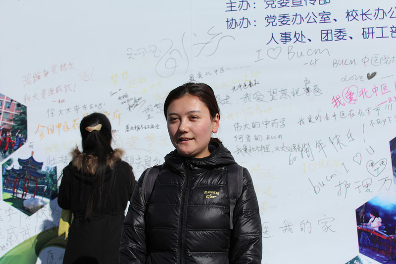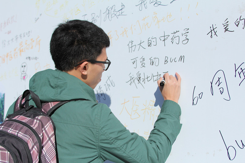 中午下課后,很多同學經過活動現場便饒有興趣地駐足參與,大家言語間互相交流想法,爭先恐后在白紙和背板上寫下心中的北中醫形象和對學校的祝福。幾位少數民族學生還特別用本民族的語言和文字抒寫了心中的北中醫。