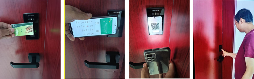 升級后,我校電子門鎖均支持實體卡、NFC卡刷卡解鎖。此外,帶有攝像頭讀頭的門鎖還可支持掃碼、刷臉解鎖。