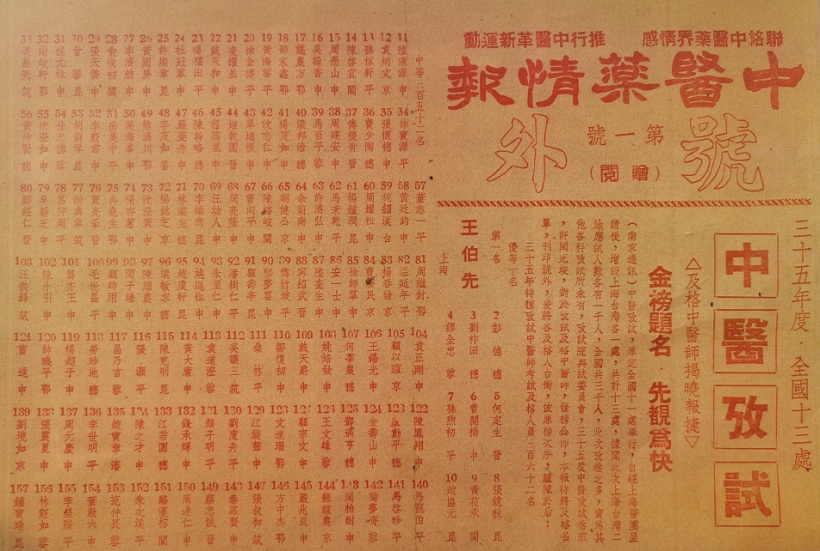 1946年,當時的南京政府舉辦了第一屆全國中醫師執業資格考試,也是民國年間唯一一次全國性中醫考試。據《中醫藥情報》報道,此次中醫師考試,全國共設考場13處,3000余人報名參加,“考卷之多,實為其他各科考試所未有”。考試合格證書到1948年才由“國民政府考試院”發下,考試之苛嚴,通過之不易,民國時期中醫師的處境可見一斑。此次費老捐贈給我校的《中醫師考試合格證書》及刊登考試榜單的《中醫藥情報》報紙,就是這一歷史時期最真實的實物見證。