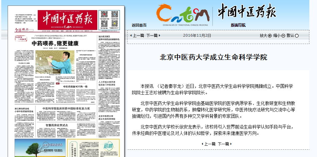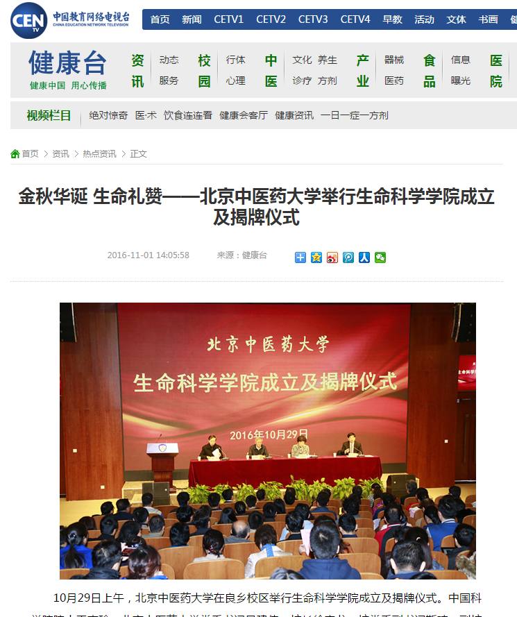 《人民日報》、《中國中醫藥報》、《健康報》、光明網、中國教育網絡電視臺等社會媒體報道我校舉行生命科學學院成立及揭牌儀式