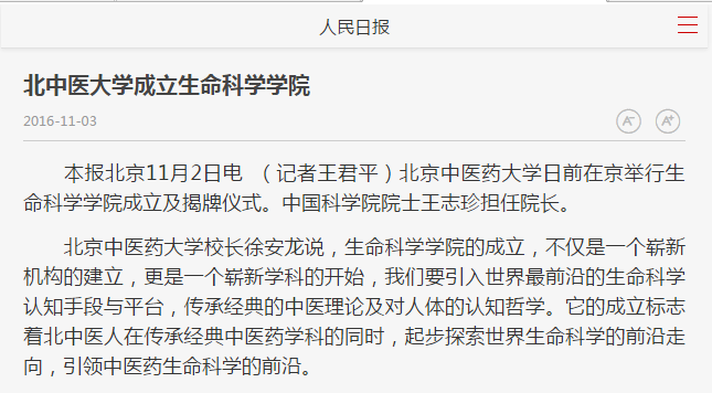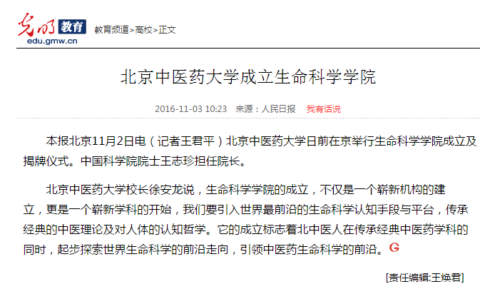 11月1日-3日,《人民日報》、《中國中醫藥報》、《健康報》、光明網、中國教育網絡電視臺等社會媒體報道我校舉行生命科學學院成立及揭牌儀式。全文如下: