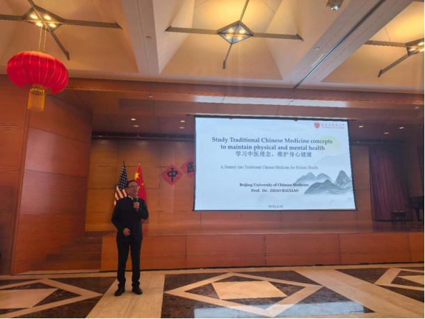 我校趙百孝教授作主題為“學習中醫理念,維護身心健康(Study Traditional Chinese Medicine Concepts to Maintain Physical and Mental Health)”的開場講座。他從陰陽、五行的哲學基石出發,深入淺出地剖析了中醫基礎理論體系,揭示了如何運用中醫智慧為當代人的身心健康保駕護航。講座內容既富有深度又兼具實用性,在場參與者紛紛表示受益良多。