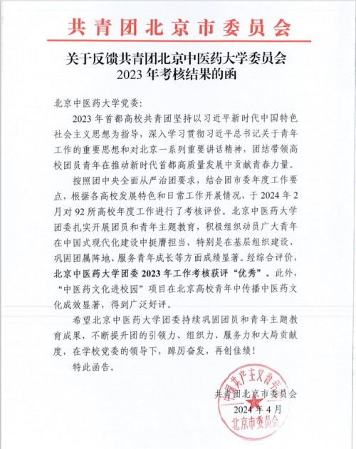 近日,共青團北京市委員會對京內的92所高校進行了考核評定。經綜合評價,北京中醫藥大學團委在2023年工作考核獲評“優秀”,這是對我校團委在年度工作中的出色表現的認可和肯定。特別是其中“中醫藥文化進校園”活動受到高度認可。該評選是按照團中央全面從嚴治團要求,結合團市委年度工作要點,對京內高校的年度工作進行考核評價后得出的結果。