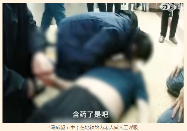 馬威望,男,2000年1月出生,北京中醫藥大學第一臨床醫學院研究生。2023年11月1日,馬威望乘地鐵時身旁老人突然倒他肩上,家屬證實其有心臟病史,他提示立刻喂服速效救心丸。與家屬將老人抬到站臺撥急救電話后老人心臟驟停,他立即為老人心肺復蘇人工呼吸持續十幾分鐘,120趕到后使用AED除顫,老人幸運脫險。事后家屬多次聯系致謝均被他婉拒。