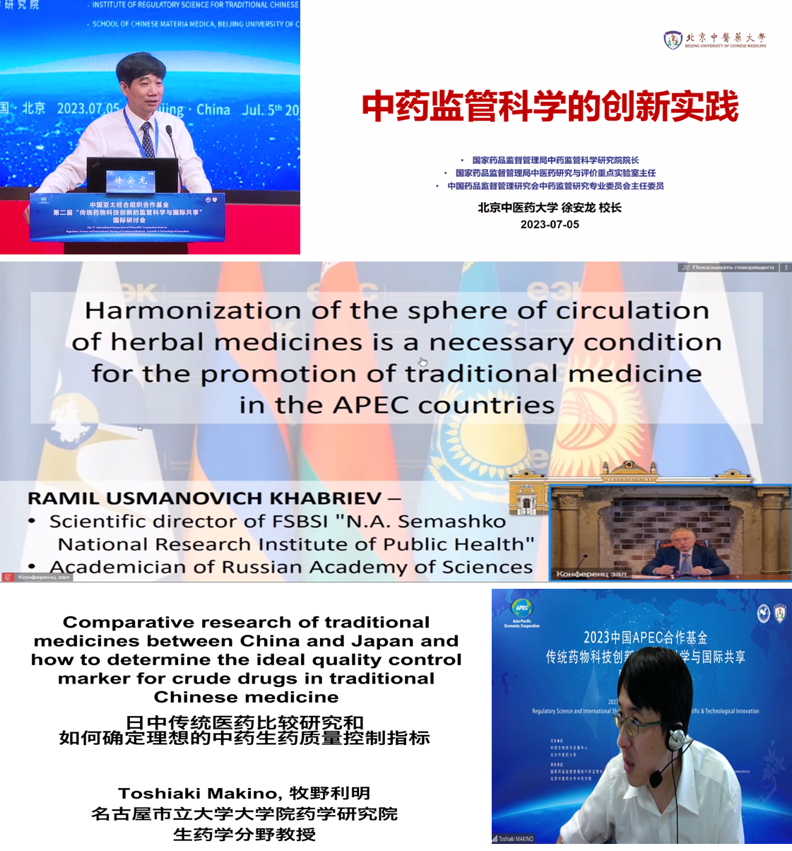大會主旨報告環節,會議主席張伯禮院士、我校徐安龍校長、俄羅斯國家科學院Ramil Usmanovich Khabriev院士分別、日本名古屋市立大學牧野利明教授,分別以《新時代中醫藥高質量發展的思考》《中藥監管科學的創新實踐》《傳統藥物流通領域的協調統一是促進APEC經濟體傳統藥物發展的必要條件》《日中傳統醫藥比較研究和如何確定理想的中藥生藥質量控制指標》為題作報告。
