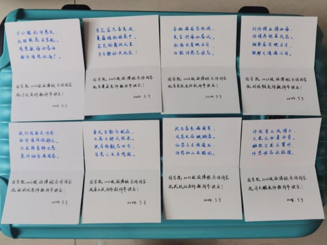 國學院2023級碩博班學生為每位老師撰寫了一首藏頭詩,將其抄寫在賀卡上,禮輕情意重,每首詩都蘊含著對老師的敬意和祝福。老師對學生的創意和用心表示高度贊賞,認為這種形式的祝福既溫馨又具有文化內涵,并鼓勵同學們努力學習,傳承和發揚國學文化。
