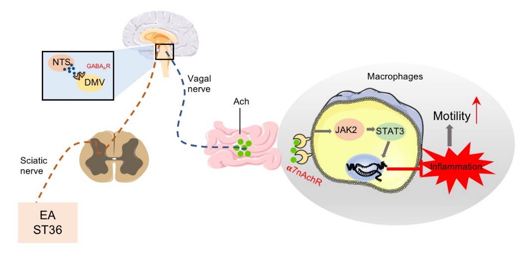 為進一步明確電針刺激下肢足三里穴興奮胃腸局部迷走神經的信號傳導通路,課題組采用腦室注射、神經切除等技術,發現迷走神經背核在其中發揮了關鍵作用。迷走神經背核是胃腸局部迷走神經傳出纖維的起源,而電針通過降低迷走神經背核中乙酰膽堿能神經元上抑制性受體GABAA的表達,興奮頸/膈下迷走神經,進而發揮抗炎作用。劉存志教授認為:“電針可能是通過調節迷走/交感神經系統的平衡發揮抗炎作用,在這里我們發現,電針足三里主要是通過激活迷走神經發揮其治療作用。”