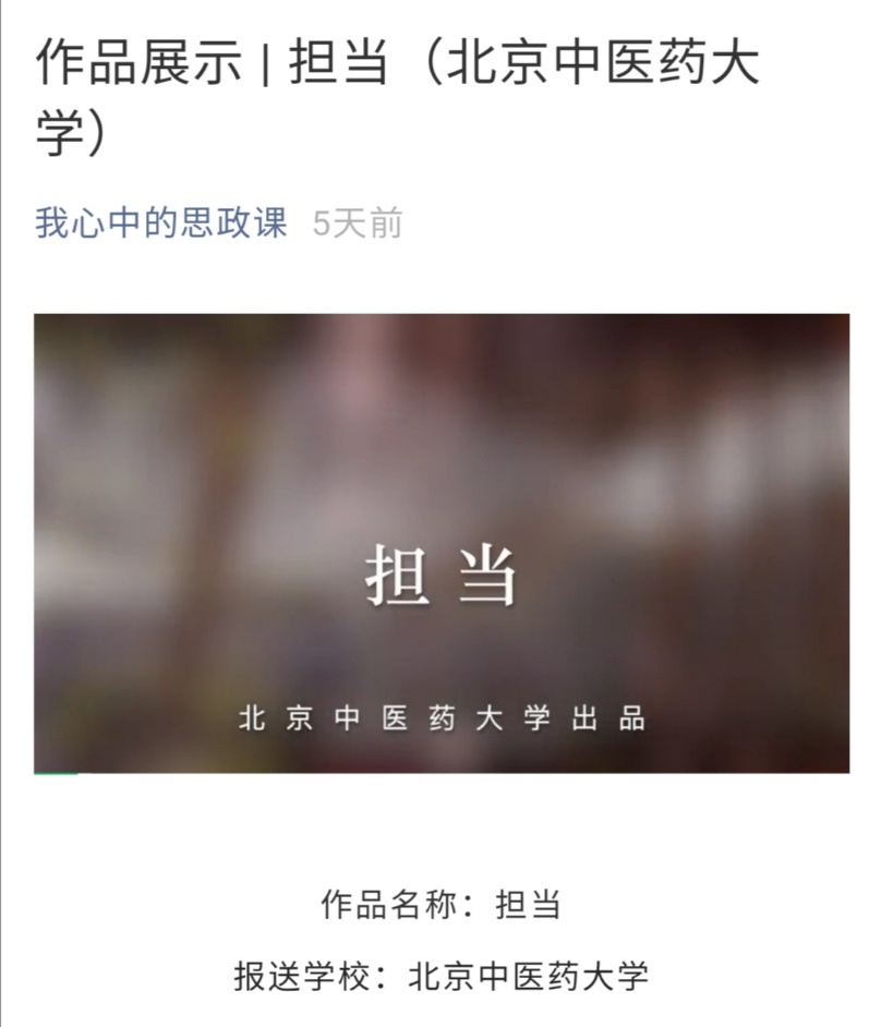 “我心中的思政課”作品《擔當》,由校團委、馬克思主義學院老師,以及學生主創們共同完成,講述了一位大一新生面對全新的環境不斷學習、蛻變、成長的小故事,同時加入了真實的抗疫元素,真實地表達了當代北中醫青年學子面對困難和挑戰時的擔當精神。馬克思主義學院教師程旺、駱夷擔任理論指導,團委代立飛老師擔任導演。影片拍攝期間既有線下場地等拍攝方面的精心準備,也有線上的多次交流、反復碰撞。在微電影拍攝期間,校黨委副書記靳琦親自參與了影片腳本和拍攝過程的討論。最終經過北京市教工委的評審選拔,該作品在眾多選送作品中脫穎而出,成功入圍第四屆全國高校大學生微電影展示。