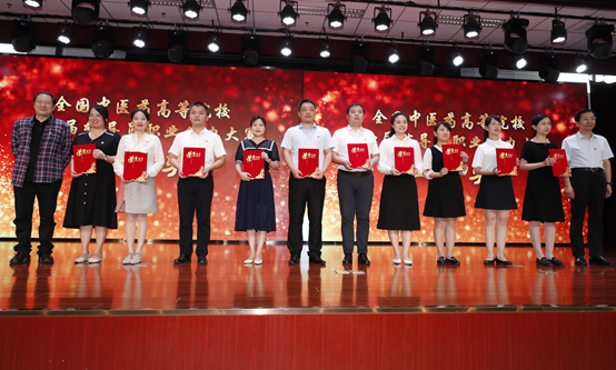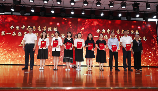 國(guó)家中醫(yī)藥管理局人事教育司盧國(guó)慧司長(zhǎng)、大賽評(píng)委會(huì)主席馮培教授為一等獎(jiǎng)獲獎(jiǎng)輔導(dǎo)員頒獎(jiǎng)。