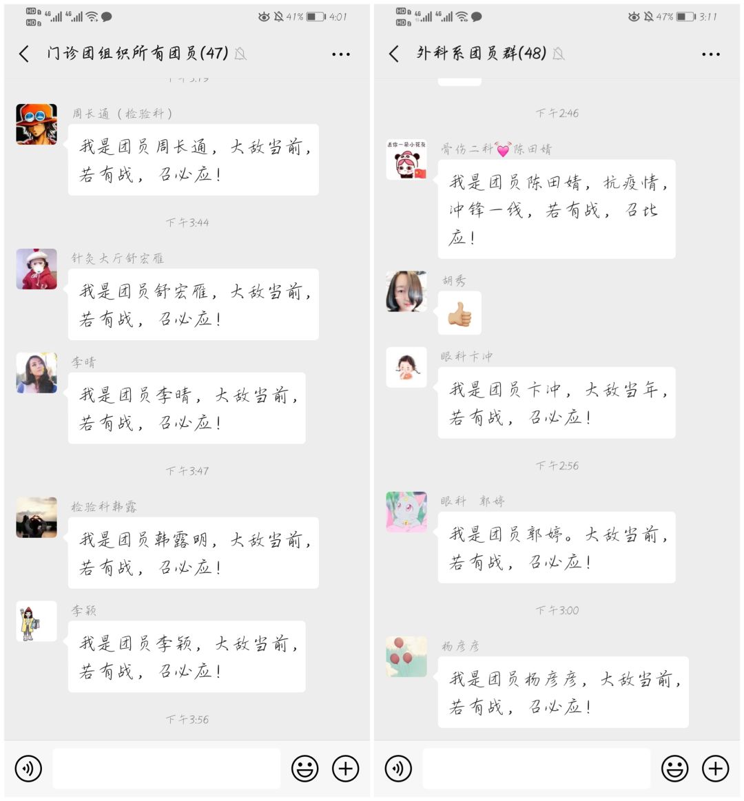同時(shí),在醫(yī)院還有這樣一群熱血青年,就是醫(yī)院的青年團(tuán)員們。他們從疫情爆發(fā)后就積極響應(yīng)醫(yī)院黨委號(hào)召,放棄休假回到工作崗位。院團(tuán)委向全體團(tuán)員正式發(fā)出倡議書,短短一天就有82名團(tuán)員主動(dòng)請(qǐng)戰(zhàn)。