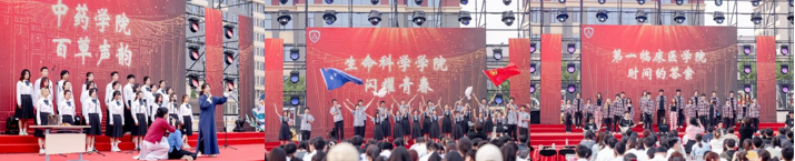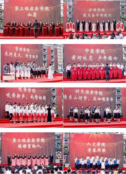 各學(xué)院按順序依次登場(chǎng)進(jìn)行學(xué)院風(fēng)采展示。第三臨床醫(yī)學(xué)院《如愿》,護(hù)理學(xué)院《致正奮斗的我們》,管理學(xué)院《長(zhǎng)河星火,時(shí)空回聲》,中醫(yī)學(xué)院《黃河詠志,少年銘心》,岐黃學(xué)院《岐黃新聲,禮贊祖國(guó)》,針灸推拿學(xué)院《情系山河夢(mèng),五四頌芳華》,第二臨床醫(yī)學(xué)院《璀璨冒險(xiǎn)人》,人文學(xué)院《青春同歌》,中藥學(xué)院《百草聲韻》,生命科學(xué)學(xué)院《閃耀青春》,第一臨床醫(yī)學(xué)院《時(shí)間的答案》,每個(gè)節(jié)目都是婉轉(zhuǎn)歌聲與真摯情感的交織,訴說(shuō)著青年傳承先輩之志、勇?lián)覈?guó)重任的堅(jiān)定決心。部分節(jié)目中,學(xué)院領(lǐng)導(dǎo)與青年教師們與同學(xué)們一同登臺(tái),唱響五四精神傳承與黨團(tuán)育人的最強(qiáng)音,引起現(xiàn)場(chǎng)陣陣歡呼與掌聲。