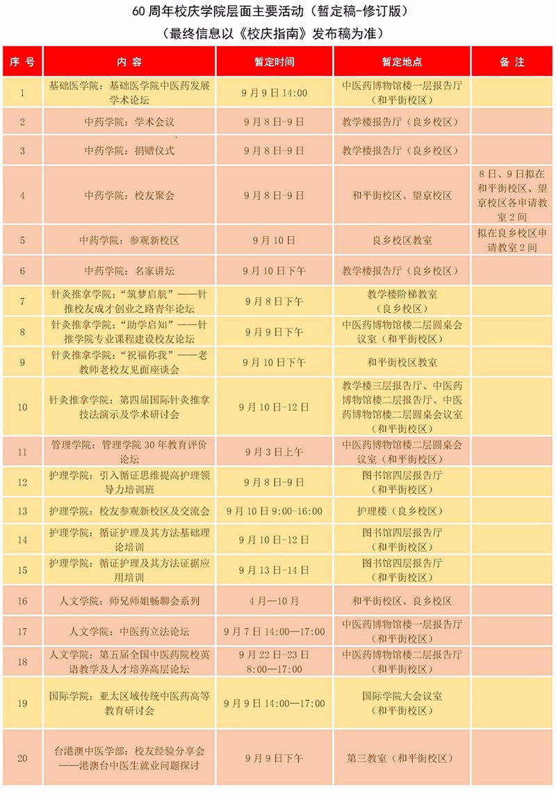 學校60周年校慶的活動設計框架已經基本成型,現在進行預發布,目的是方便大家安排校慶活動期間的行程。這些活動的時間、地點仍然存在變化的可能,最終定案我們將發布《校慶指南》。