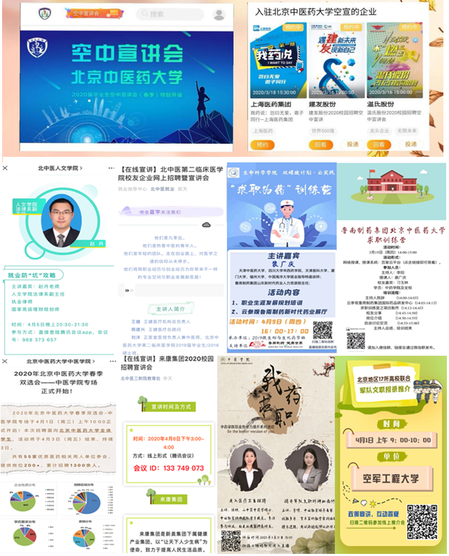 各學院也結合自身特點和學生需求,持續(xù)舉辦畢業(yè)生就業(yè)、招聘宣講活動,如中藥學院的“職業(yè)勝任力提升”系列活動、生命科學學院的“雙螺旋計劃--云實踐”、管理學院的選調生及西部就業(yè)經(jīng)驗分享宣講、護理學院的 “拆掉思維里的墻”師生創(chuàng)新創(chuàng)業(yè)系列培訓、人文學院的“就業(yè)防‘坑’攻略”、第一臨床醫(yī)學院的畢業(yè)生求職經(jīng)驗分享會、第二臨床醫(yī)學院的校友企業(yè)網(wǎng)上招聘暨宣講會、第三臨床醫(yī)學院的北京朝陽中西醫(yī)結合急診搶救中心專場網(wǎng)絡宣講會等。這些形式靈活、內容豐富的宣講會,讓畢業(yè)生更好地了解招聘流程、應聘要點,及時開啟了線上就業(yè)之旅。