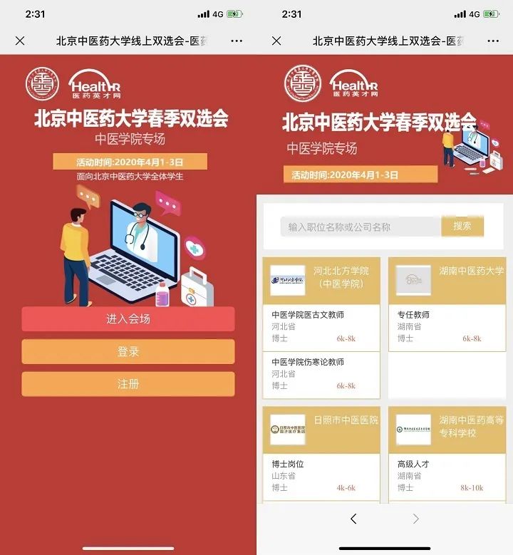 全新的“云招聘”系列活動在疫情發(fā)生后第一時間上線,不斷拓寬學生應聘渠道。2月23日,我校第三屆暨2020年春季網(wǎng)絡雙選會上線,這是北京地區(qū)第一場,也是醫(yī)學院校中最早的一場網(wǎng)絡雙選會;3月25日,第四屆暨2020年醫(yī)藥企業(yè)專場網(wǎng)絡雙選會也順利上線。兩場網(wǎng)絡雙選會共吸引了300余家醫(yī)療衛(wèi)生行業(yè)用人單位參會,提供職位1200余個,崗位數(shù)量9000余個,點擊量達22萬余次,簡歷投遞量達15000余份,各項數(shù)據(jù)指標均創(chuàng)歷史新高。4月15日,第五屆網(wǎng)絡雙選會暨醫(yī)院專場招聘會也將在線上開啟。