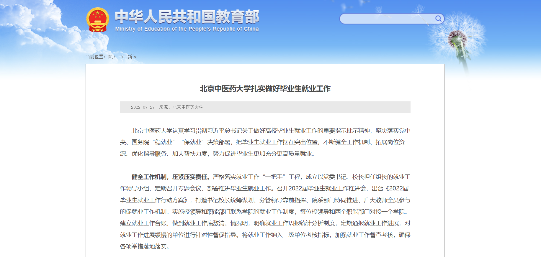 教育部網(wǎng)站報道我校扎實做好畢業(yè)生就業(yè)工作北京中醫(yī)藥大學認真學習貫徹習近平總書記關于做好高校畢業(yè)生就業(yè)工作的重要指示批示精神,堅決落實黨中央、國務院“穩(wěn)就業(yè)”“保就業(yè)”決策部署,把畢業(yè)生就業(yè)工作擺在突出位置,不斷健全工作機制、拓展崗位資源、優(yōu)化指導服務、加大幫扶力度,努力促進畢業(yè)生更加充分更高質(zhì)量就業(yè)。012022-08