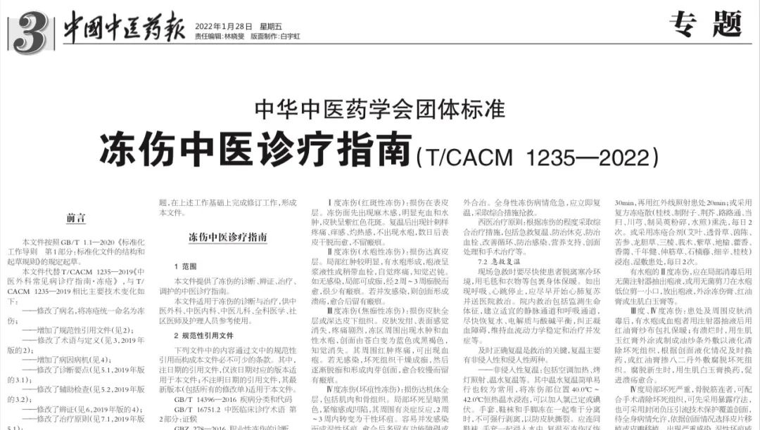 助力冬奧!《凍傷中醫(yī)診療指南》發(fā)布,為凍傷防治確立中醫(yī)診療標準日前,中華中醫(yī)藥學會團體標準《凍傷中醫(yī)診療指南》(T/CACM1235-2022)發(fā)布,該《指南》旨在推薦有循證醫(yī)學證據(jù)的凍傷中醫(yī)診斷與治療方法,指導臨床醫(yī)生和護理人員規(guī)范使用中醫(yī)藥進行臨床實踐,加強對凍傷患者的管理。282022-01