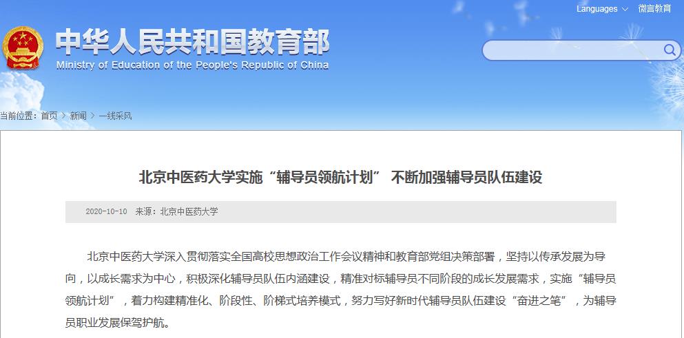 教育部網(wǎng)站報(bào)道我校實(shí)施“輔導(dǎo)員領(lǐng)航計(jì)劃” 不斷加強(qiáng)輔導(dǎo)員隊(duì)伍建設(shè)北京中醫(yī)藥大學(xué)深入貫徹落實(shí)全國(guó)高校思想政治工作會(huì)議精神和教育部黨組決策部署,堅(jiān)持以傳承發(fā)展為導(dǎo)向,以成長(zhǎng)需求為中心,積極深化輔導(dǎo)員隊(duì)伍內(nèi)涵建設(shè),精準(zhǔn)對(duì)標(biāo)輔導(dǎo)員不同階段的成長(zhǎng)發(fā)展需求,實(shí)施“輔導(dǎo)員領(lǐng)航計(jì)劃”,著力構(gòu)建精準(zhǔn)化、階段性、階梯式培養(yǎng)模式,努力寫(xiě)好新時(shí)代輔導(dǎo)員隊(duì)伍建設(shè)“奮進(jìn)之筆”,為輔導(dǎo)員職業(yè)發(fā)展保駕護(hù)航。022020-11