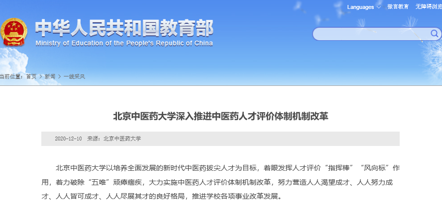 教育部網(wǎng)站報(bào)道我校深入推進(jìn)中醫(yī)藥人才評(píng)價(jià)體制機(jī)制改革北京中醫(yī)藥大學(xué)以培養(yǎng)全面發(fā)展的新時(shí)代中醫(yī)藥拔尖人才為目標(biāo),著眼發(fā)揮人才評(píng)價(jià)“指揮棒”“風(fēng)向標(biāo)”作用,著力破除“五唯”頑瘴痼疾,大力實(shí)施中醫(yī)藥人才評(píng)價(jià)體制機(jī)制改革,努力營(yíng)造人人渴望成才、人人努力成才、人人皆可成才、人人盡展其才的良好格局,推進(jìn)學(xué)校各項(xiàng)事業(yè)改革發(fā)展。102020-12