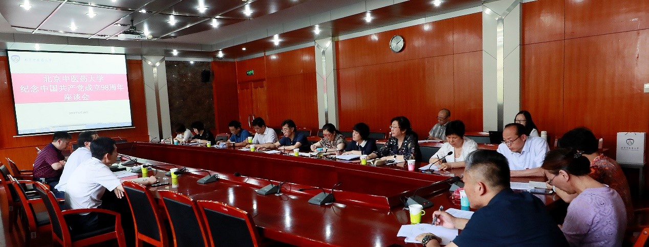 慶祝中國共產黨成立98周年系列活動6月28日下午,在“七一”即將到來之際,作為學校慶祝中國共產黨成立98周年系列活動之一,13位二級黨組織負責同志共聚和平街校區中醫藥博物館二層圓桌會議室座談,校黨委副書記靳琦,副校長王偉,黨委常委、宣傳部部長張繼旺參加會議。座談會由靳琦同志主持。會議的主題為“慶祝中國共產黨成立98周年,為加強學校黨的政治建設建言獻策”。會場內,氣氛熱烈,大家暢所欲言。042019-07