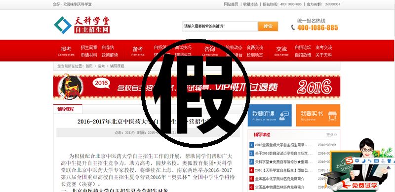 【聲明】關(guān)于“天科學堂”網(wǎng)站發(fā)布“北中醫(yī)自主招生夏令營”虛假信息的聲明2015年8月8日,一家名為“天科學堂”的網(wǎng)站發(fā)布了“2016-2017年北京中醫(yī)藥大學自主招生夏令營招生簡章”。近期,隨著夏令營招生季的到來,該條消息得到了較多關(guān)注。經(jīng)與我校招生與就業(yè)處核實,我校并未開設(shè)此夏令營,該條消息為虛假信息,特此聲明。282016-03